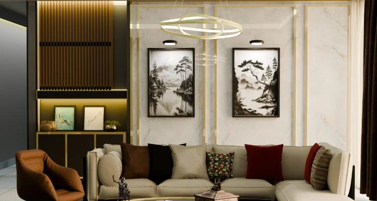 A raised ceiling enhances the living area in small spaces, making the room feel more open and airy. Thoughtful interior arrangement and small lounge decor in the drawing room create a cozy yet stylish environment, maximizing both function and visual appeal.