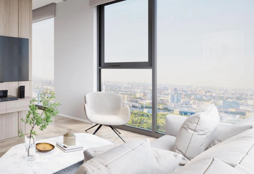 A floor-to-ceiling window in a tiny modern home brings abundant natural light, instantly opening up the small living room. Thoughtful furnishing and arrangement in the sitting or drawing area make the space feel larger while maintaining style. Careful planning ensures the home remains cozy, functional, and visually appealing.
