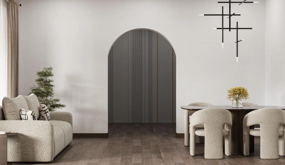 Adding an entrance in a small living room that leads to the balcony creates a sitting area with both cool and warm tones. This home inspiration design idea maximizes space while blending comfort and style, making the room feel open and inviting.