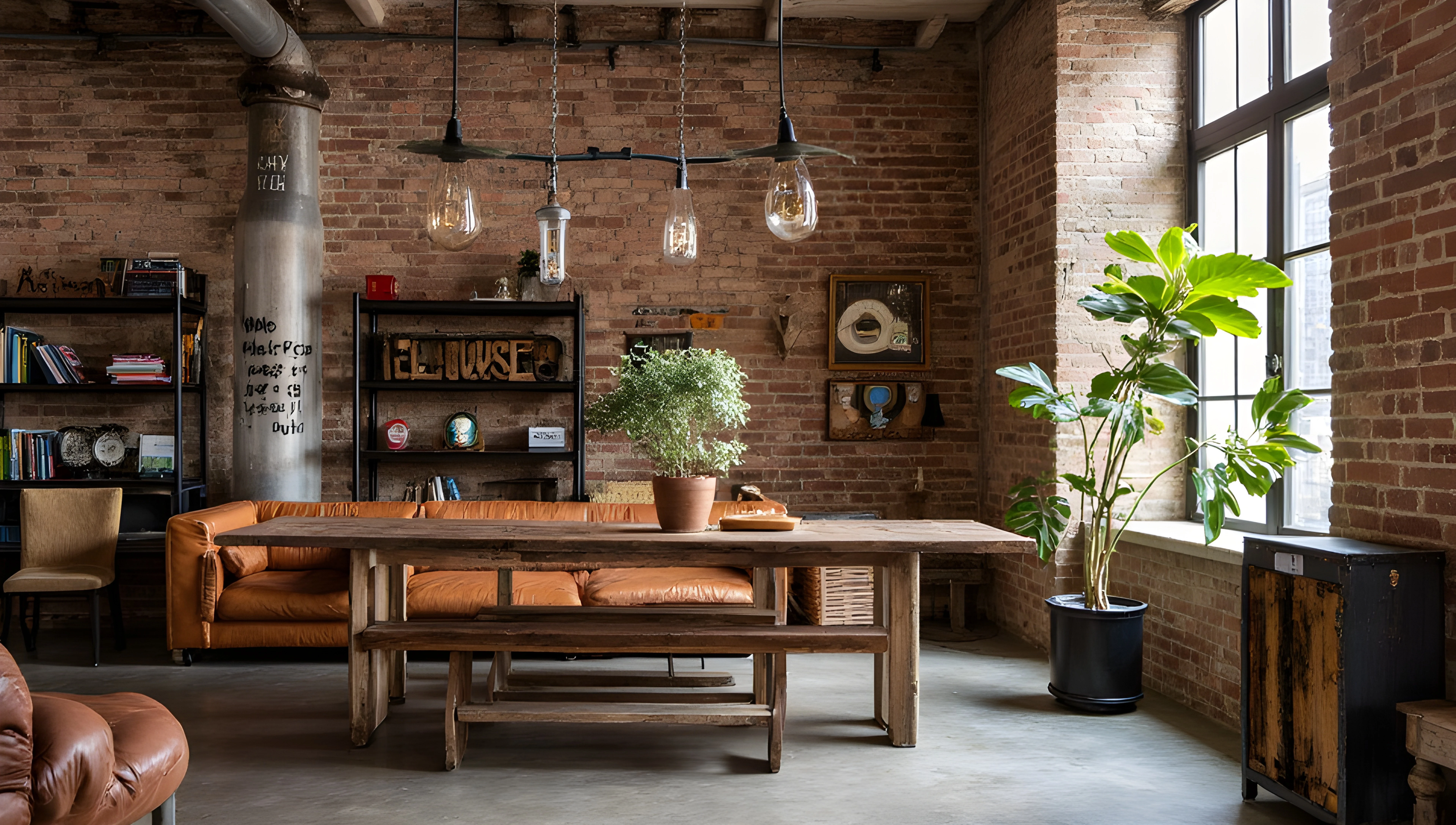 Red bricks and metal pipelines interweave to create a raw industrial feel. Vintage leather sofas, art prints and green plants are dotted around. Every design hides an artistic tribute to the industrial era, creating a personalized living space full of wild charm in warm light.