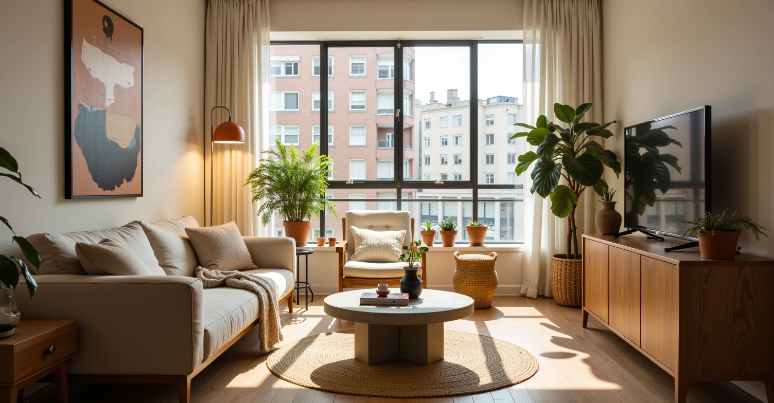 It creates tranquility with wood, weaving, and plenty of green plants. Light warm tones match minimalist furniture. Every detail shows a preference for natural textures, filling the space with relaxed poetic life.