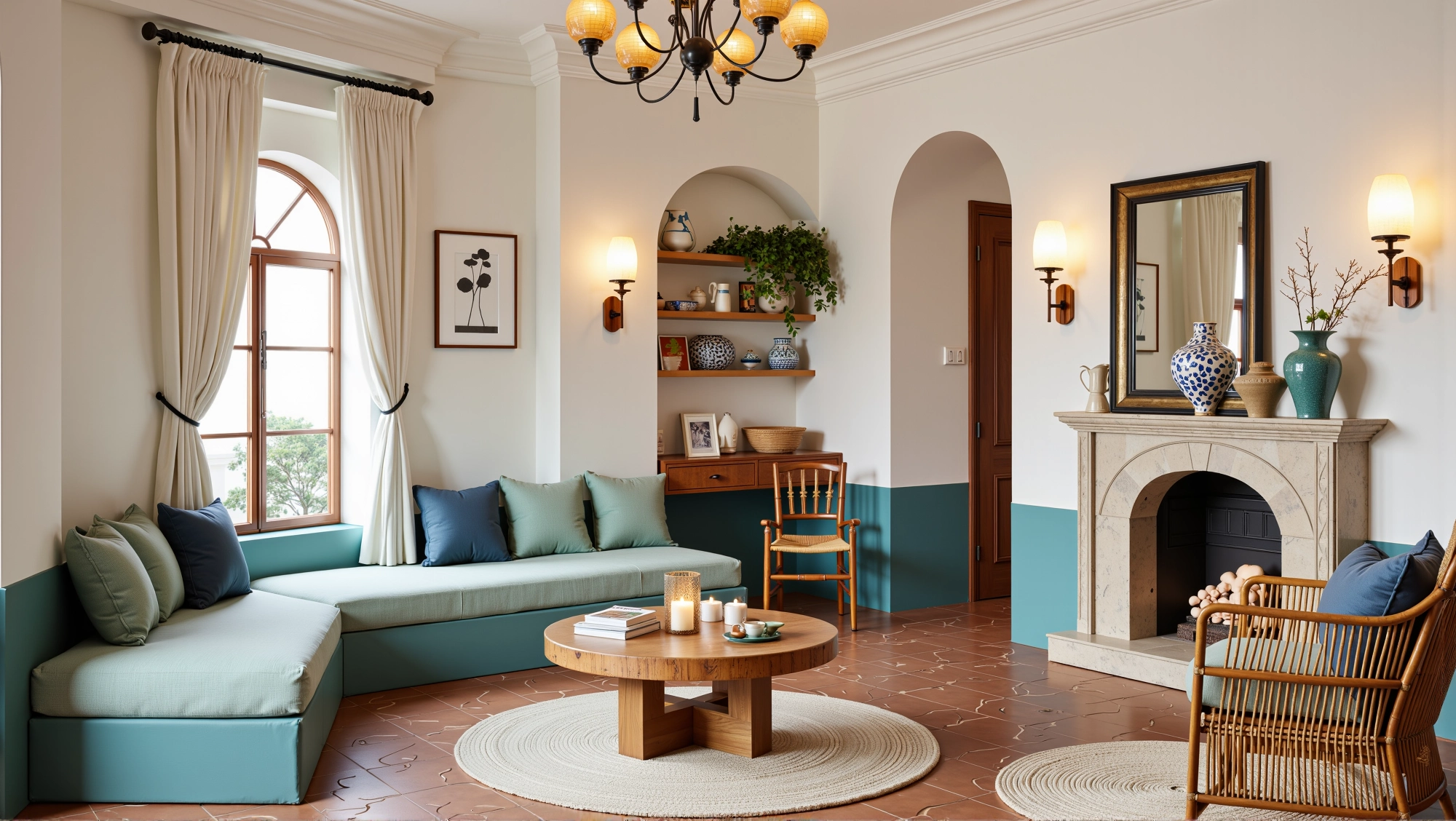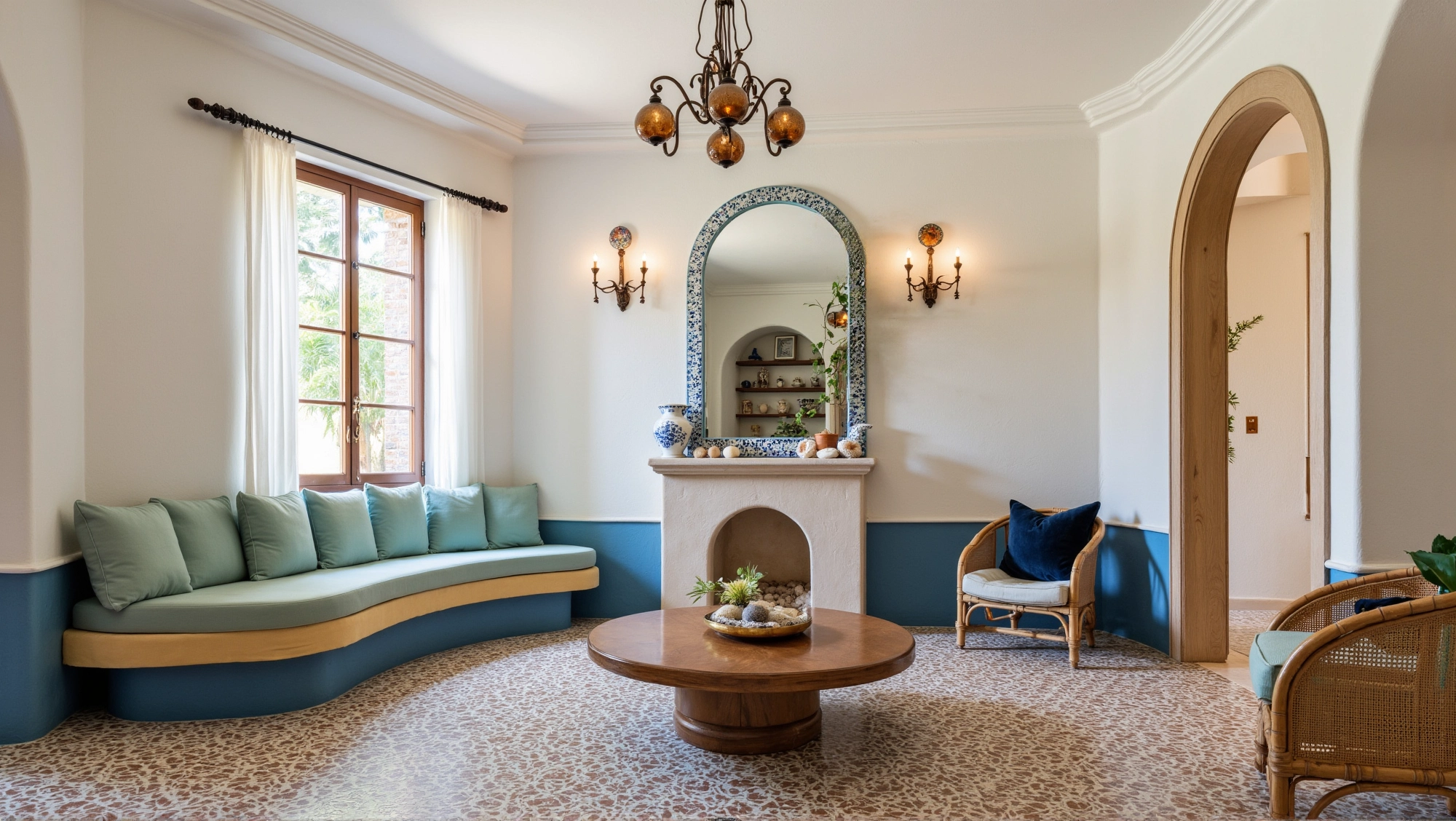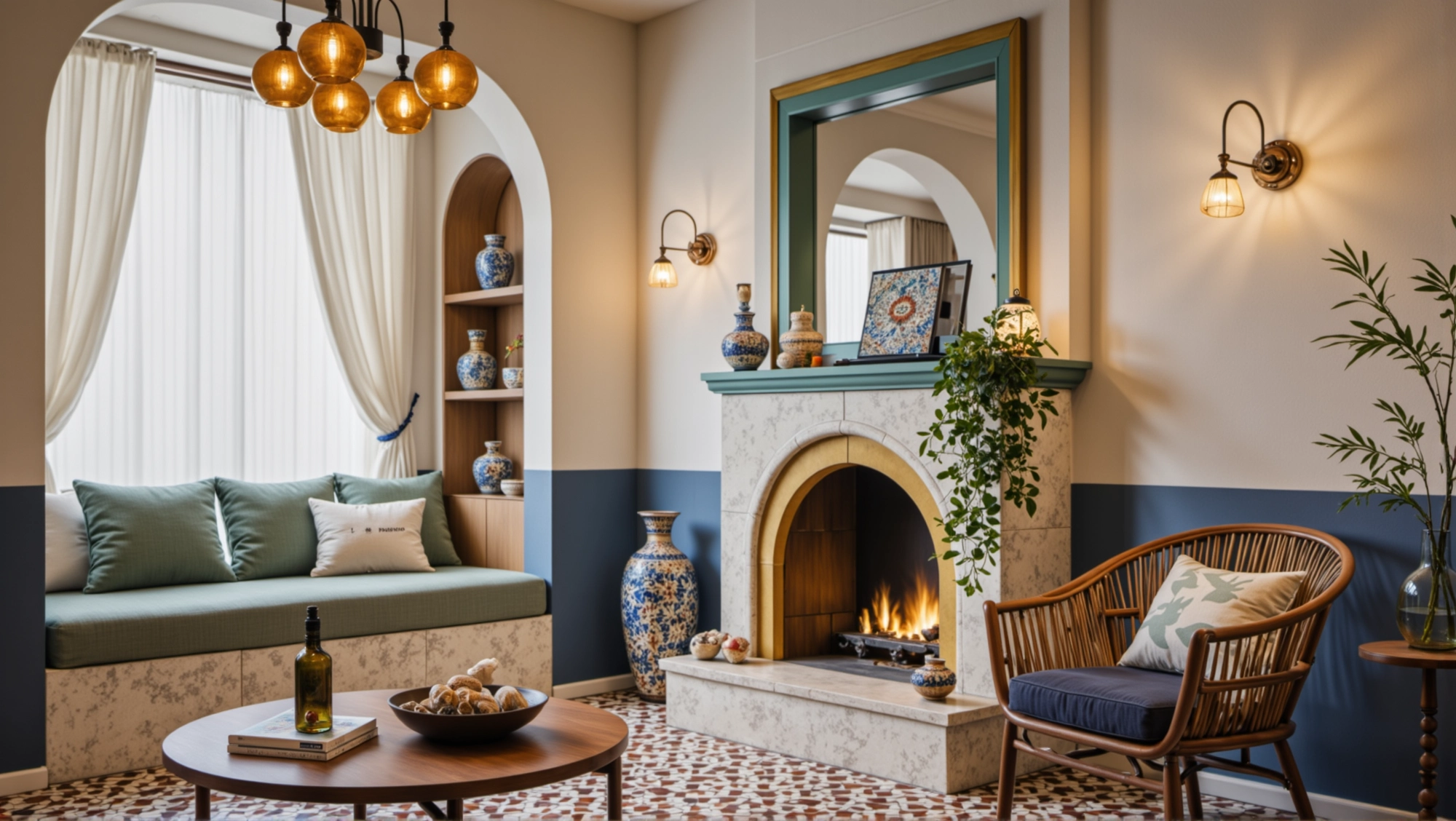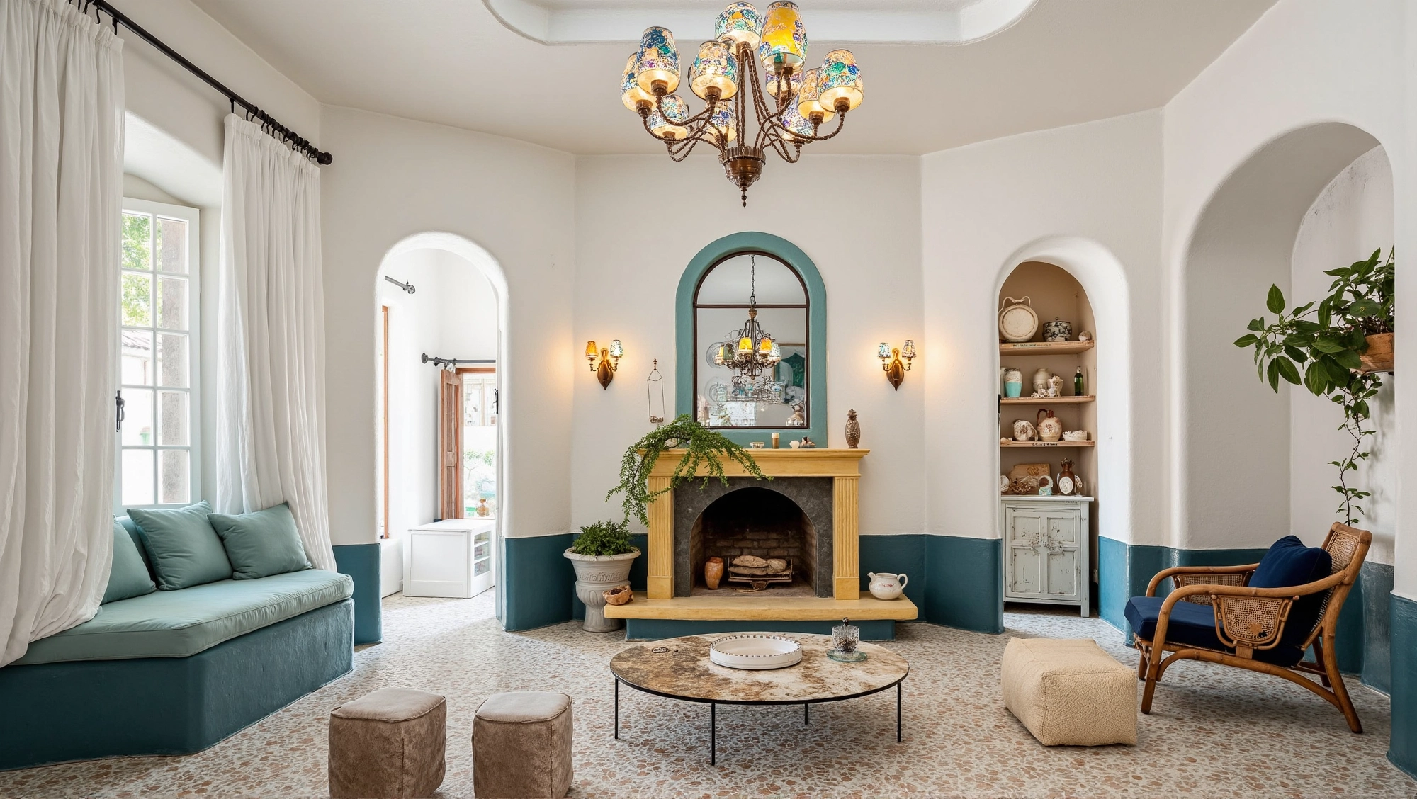 The space is dominated by fresh colors such as blue and white, with arched doors and windows elements everywhere. Matched with rattan furniture, ceramic ornaments and green plants, it creates a leisurely and comfortable atmosphere. In the living room, the fireplace, art paintings and soft lights set off each other, making the space not only have a retro charm.