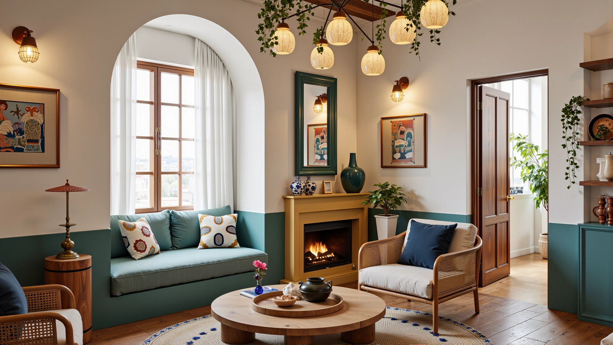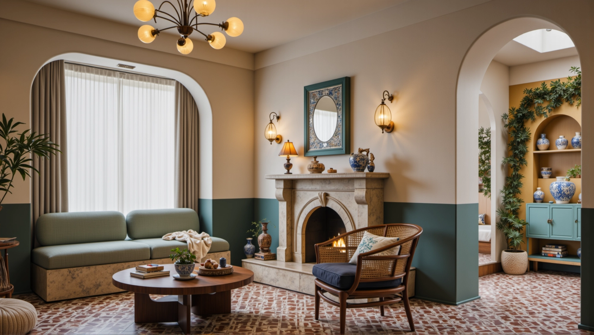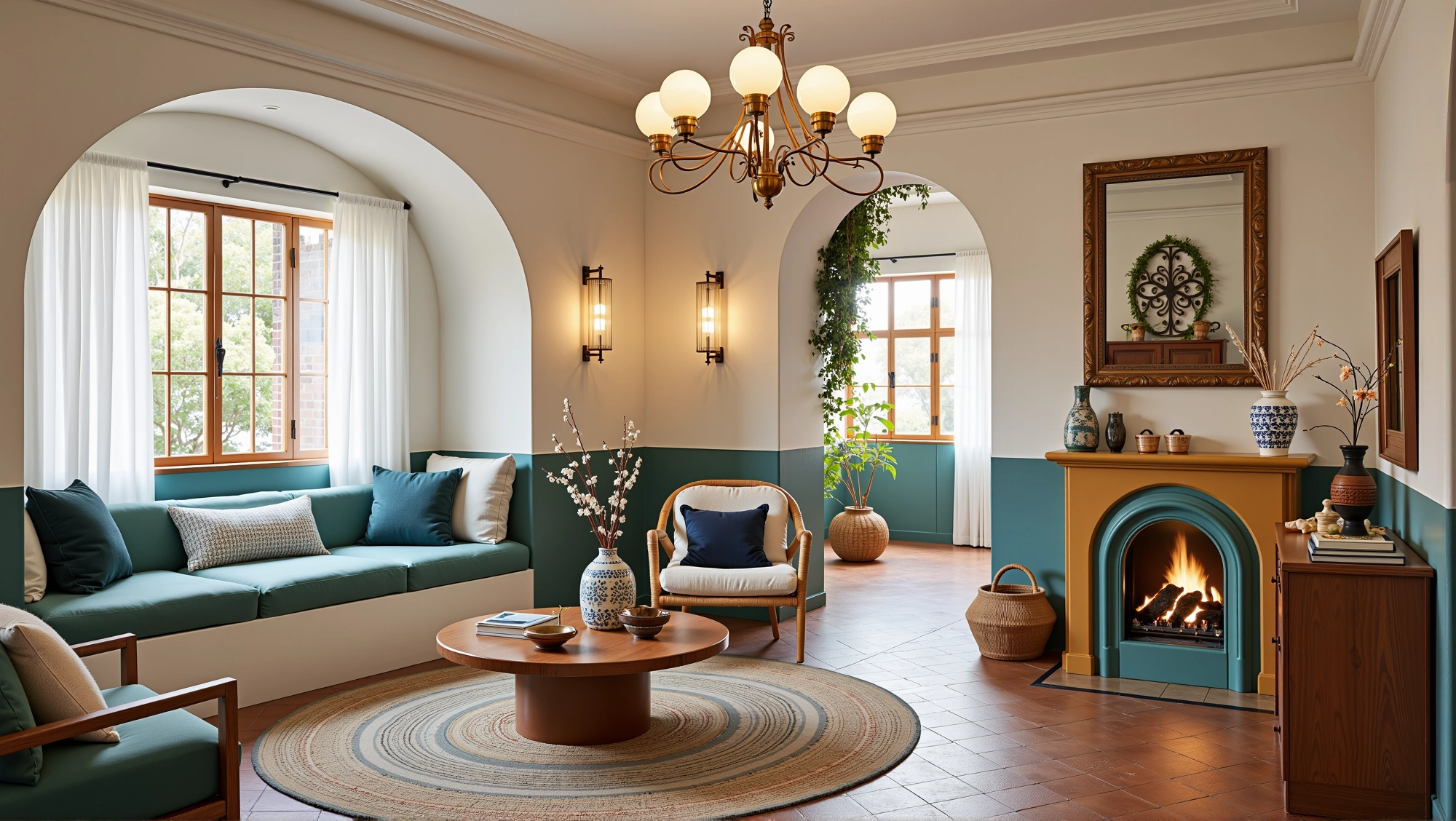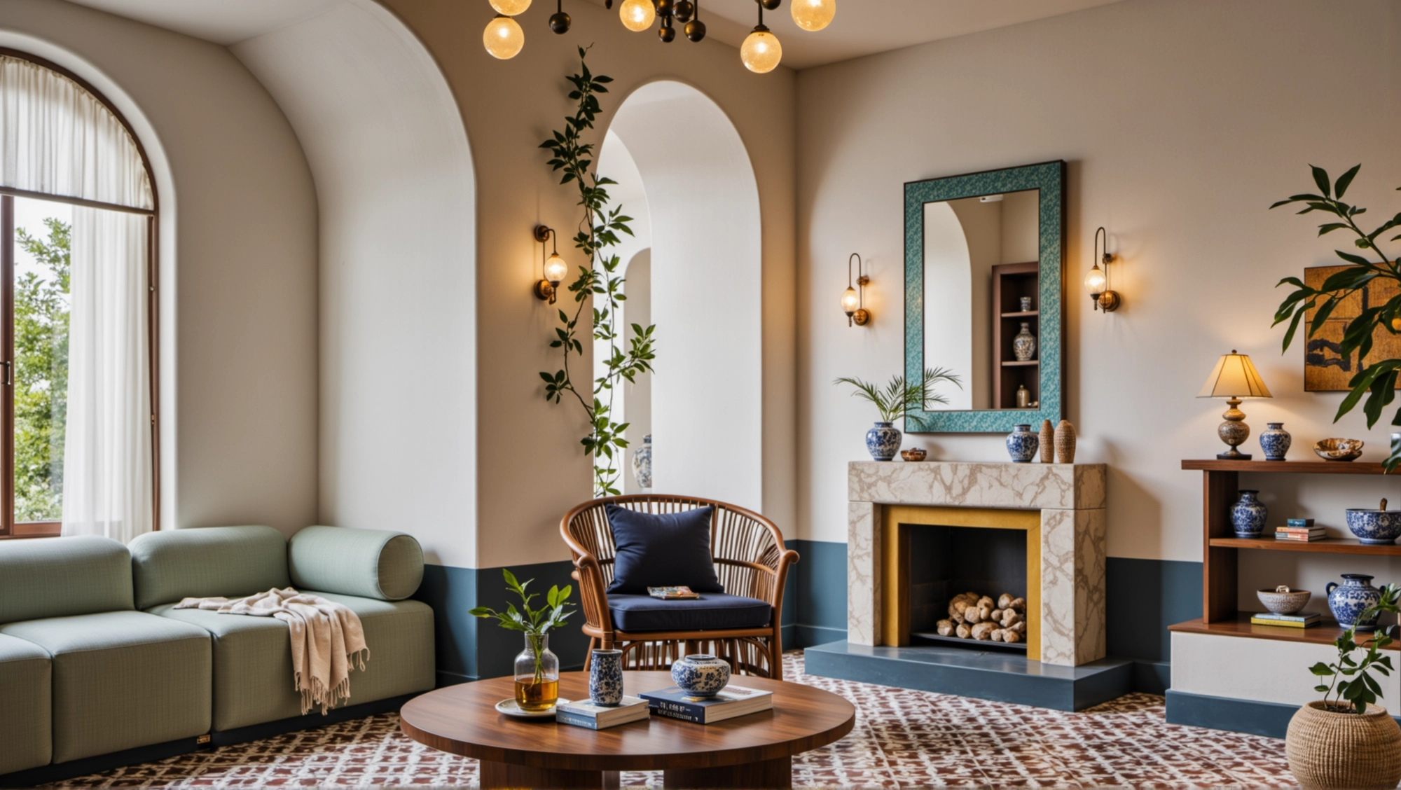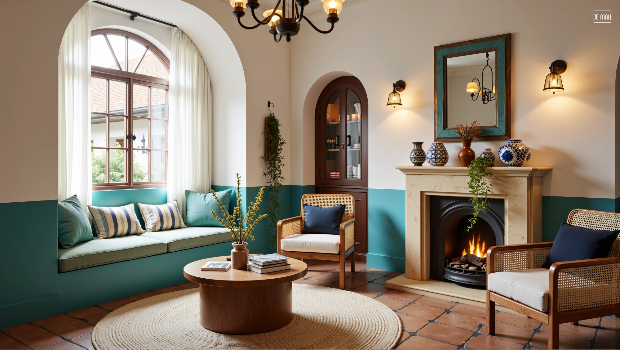 The space is dominated by fresh colors such as blue and white, with arched doors and windows elements everywhere. Matched with rattan furniture, ceramic ornaments and green plants, it creates a leisurely and comfortable atmosphere. In the living room, the fireplace, art paintings and soft lights set off each other, making the space not only have a retro charm.