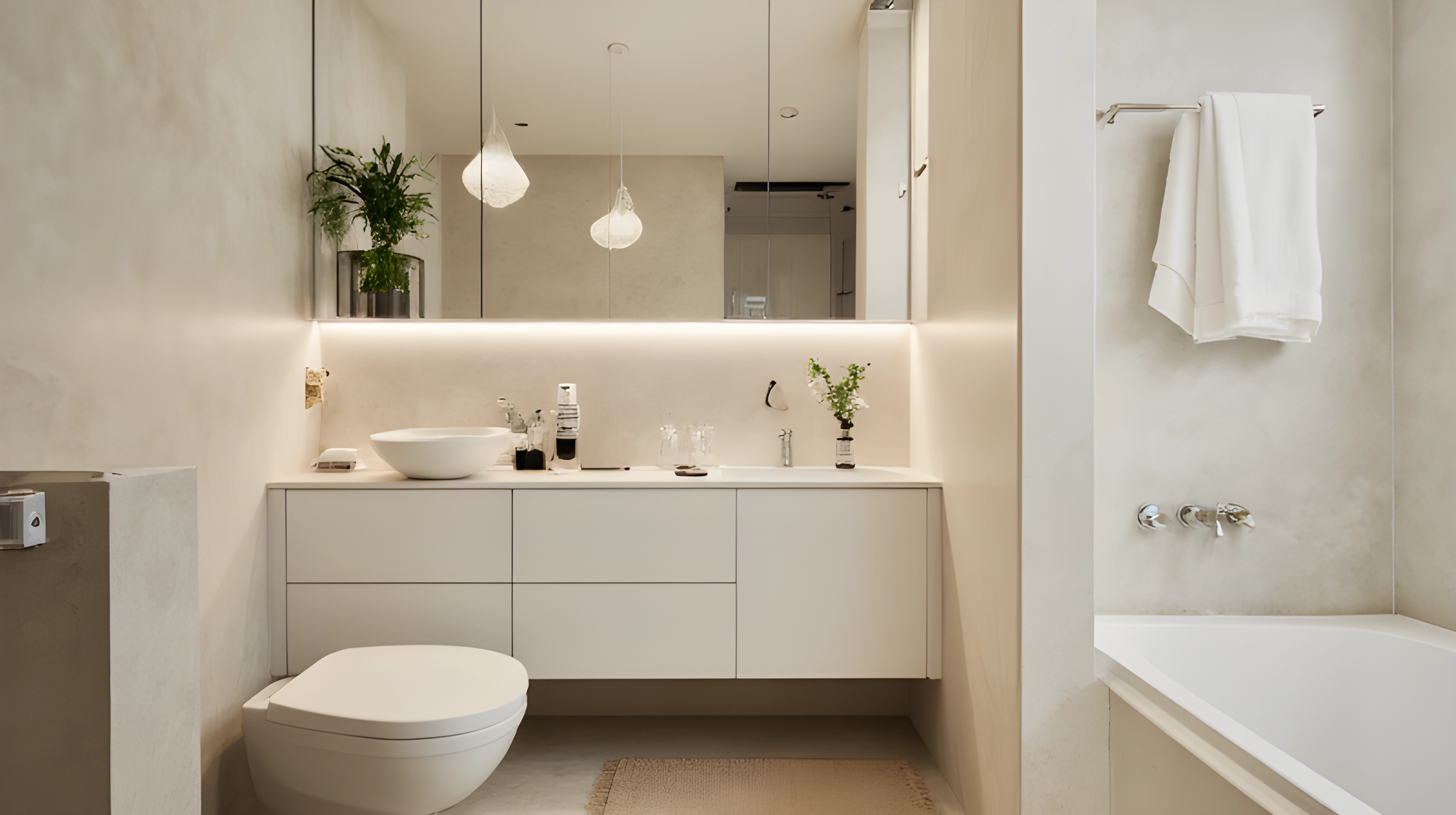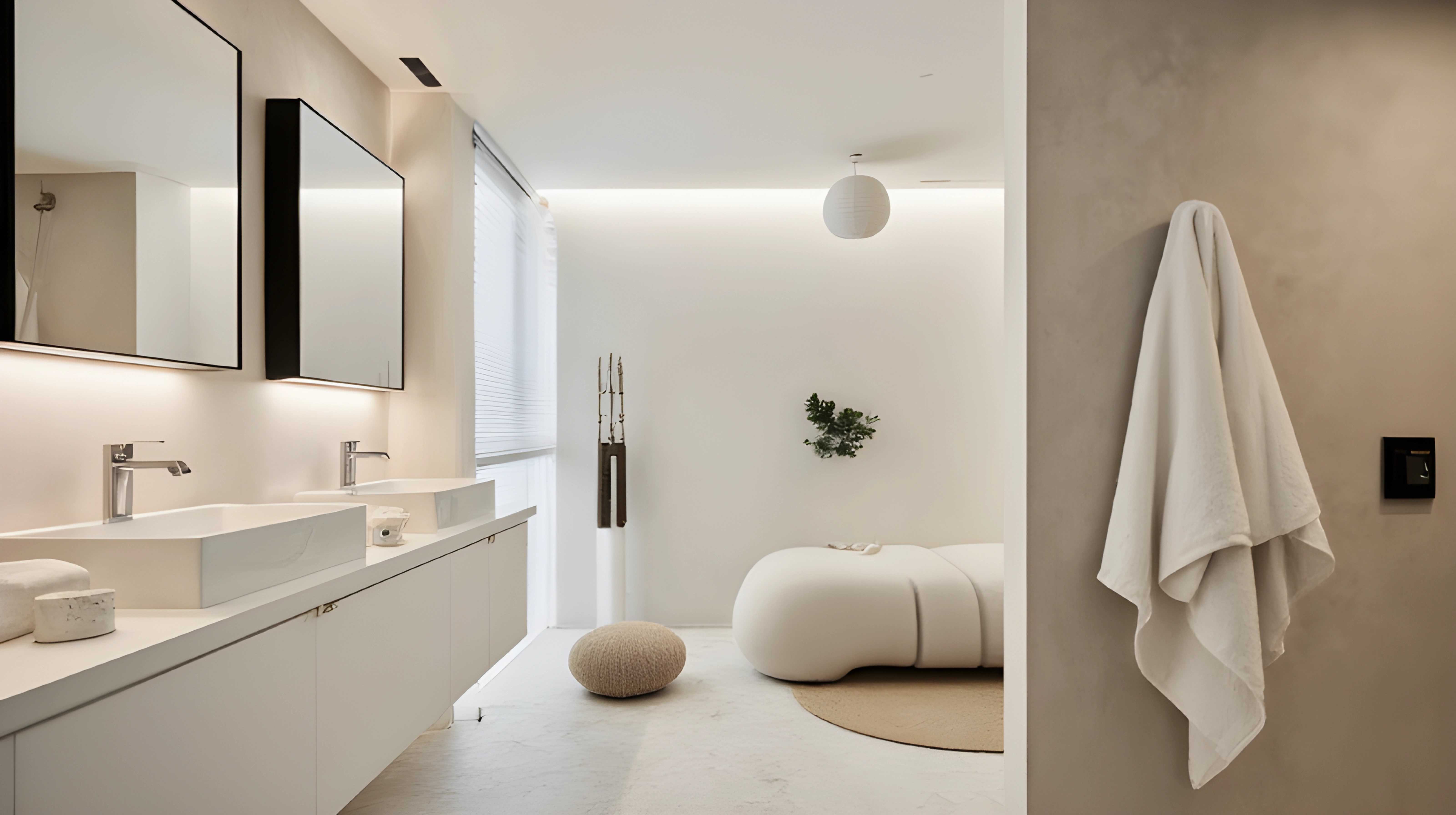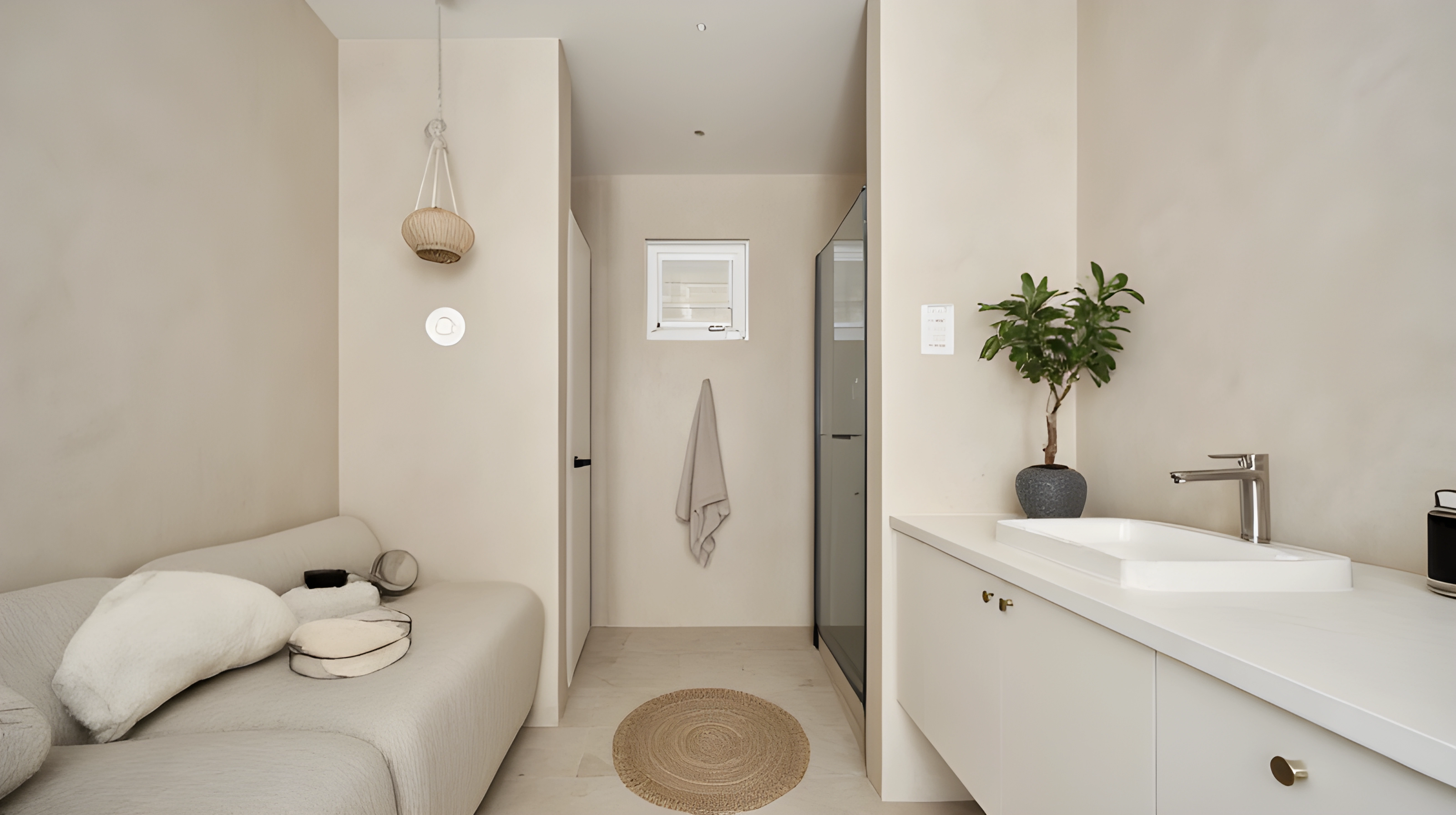 The whole space is dominated by soft light colors, with white sanitary ware matching the light beige walls, which is concise and clean. Matched with small objects with log texture, woven elements and vibrant green plants, plus soft lighting, the bathroom not only has the simplicity and neatness of modern design, but also is full of a natural and warm healing atmosphere.