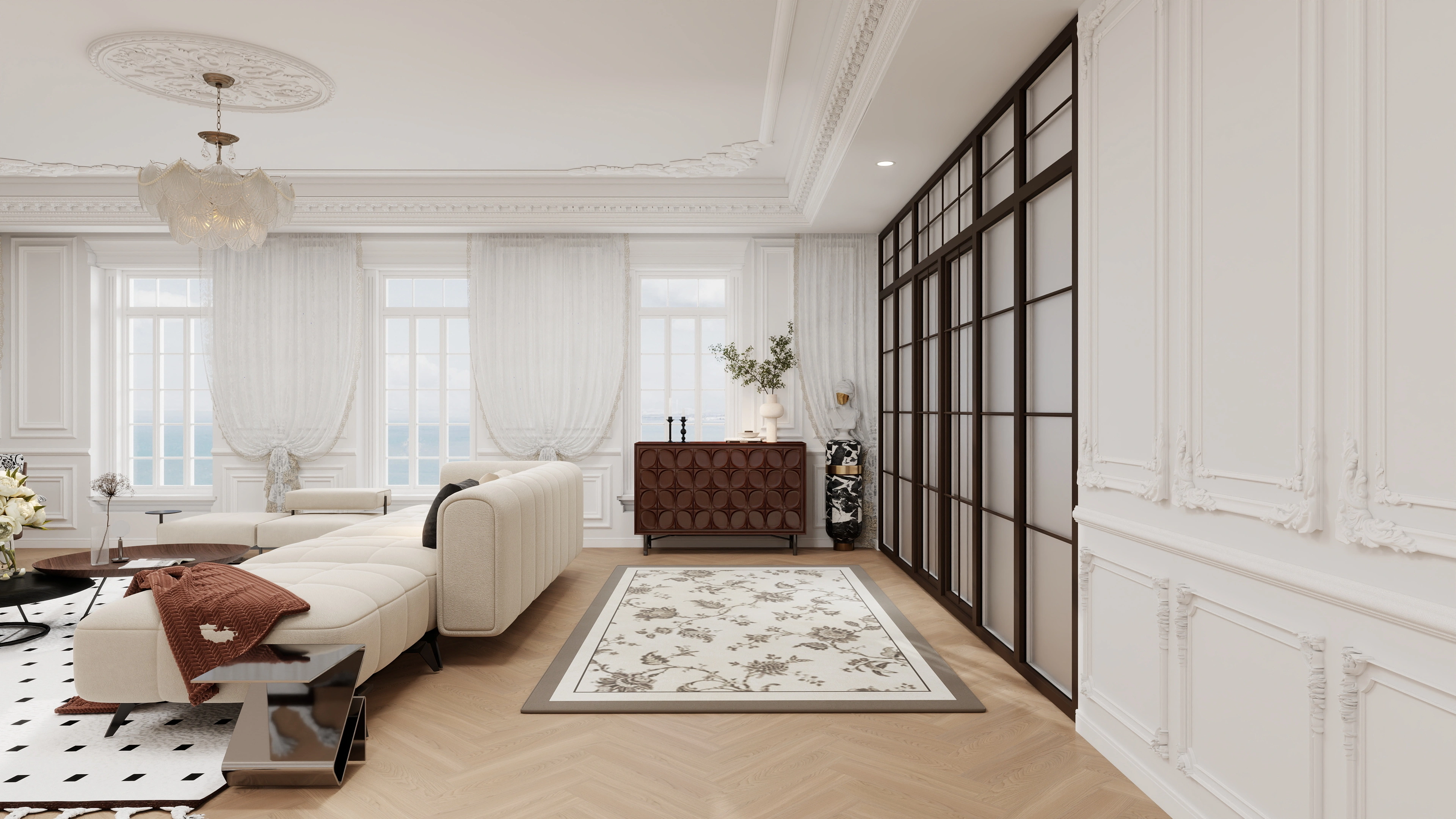This interior design fully demonstrates the French light luxury charm. In the living room, exquisite gypsum lines, gorgeous chandeliers and textured furniture complement each other. The overall space cleverly integrates the romantic elegance of French style with the exquisite texture of light luxury, just like a beautiful picture depicting an elegant life.