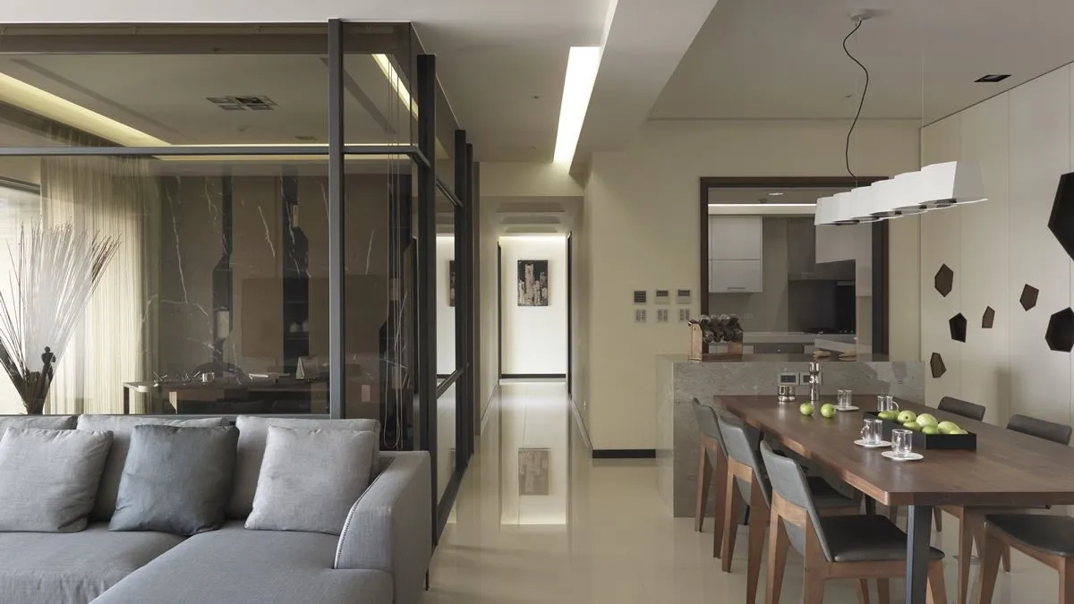 The dining room wall combines open display cabinets with sharp-edged elements to integrate display functions and achieve a sense of aesthetics with staggered and scattered multi-corner structures of varying sizes.
