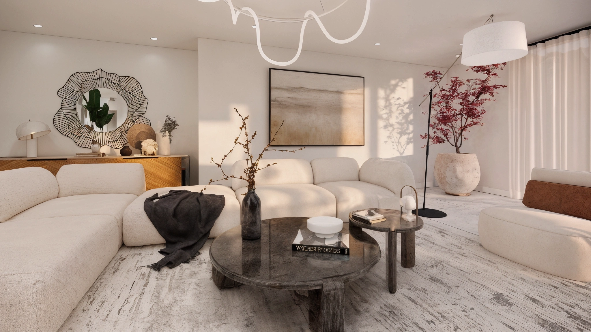 This modern minimalist living room blends warmth and elegance with soft neutral tones, organic textures, and natural wood accents. A sculptural sofa, statement lighting, and curated décor create a serene, inviting space that embodies contemporary comfort and timeless style.