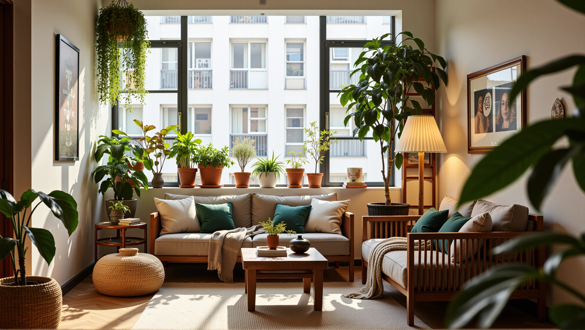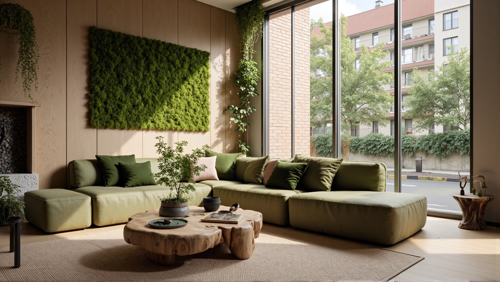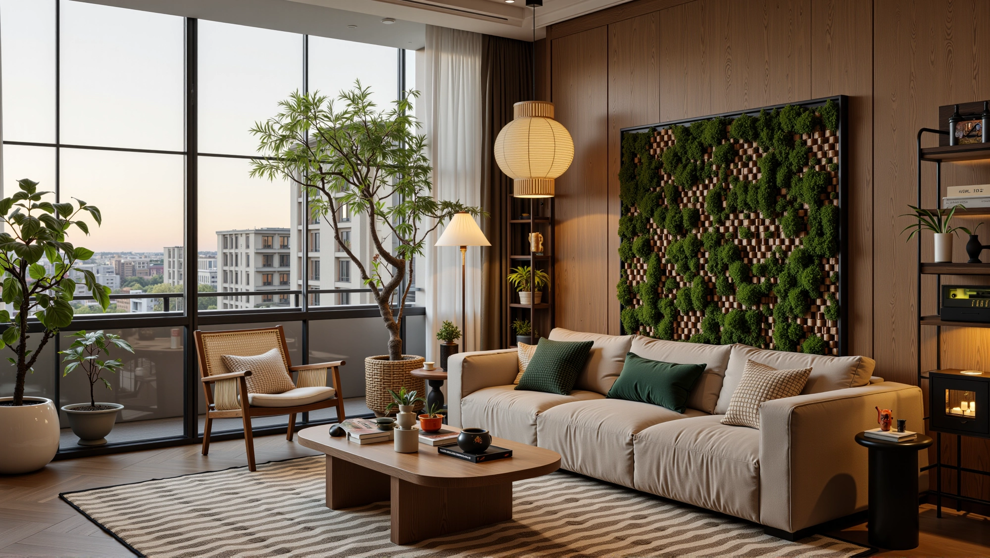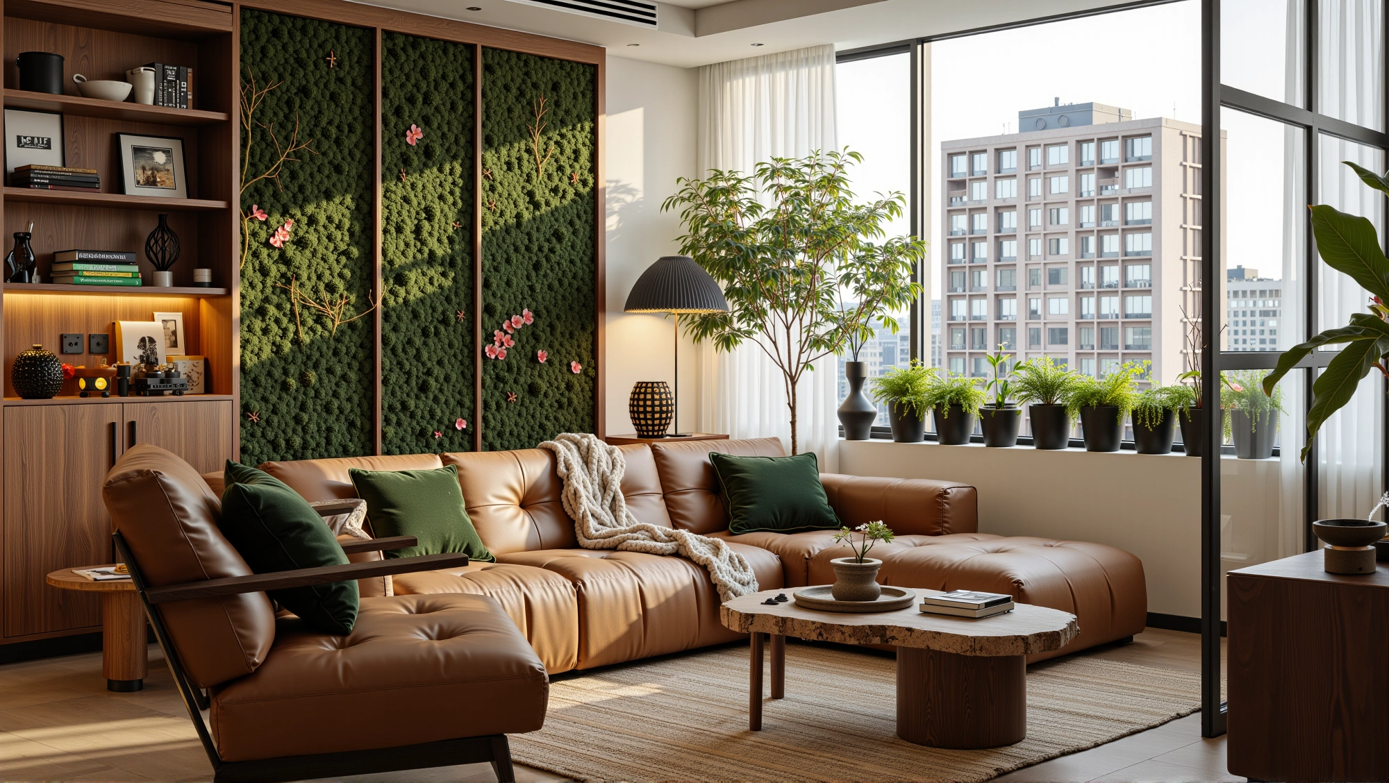 The log furniture is simple and warm, and many green plants, such as wall green plant decorations and various potted plants, matching the urban scenery outside the window. The soft light spills through the large windows, making the living room not only full of natural vitality, but also with urban elegance, as if people in it can find a quiet and natural resting place in the noisy city.