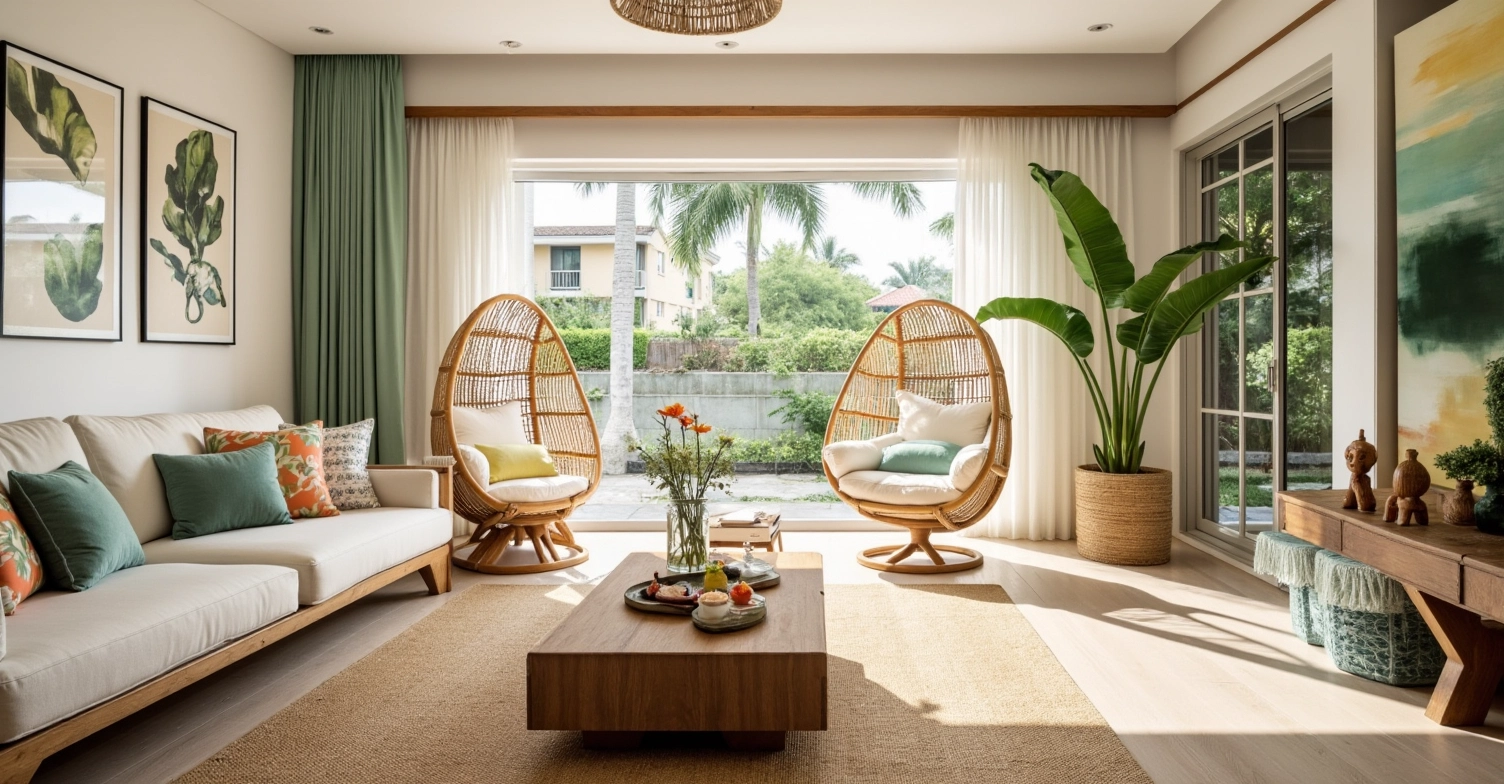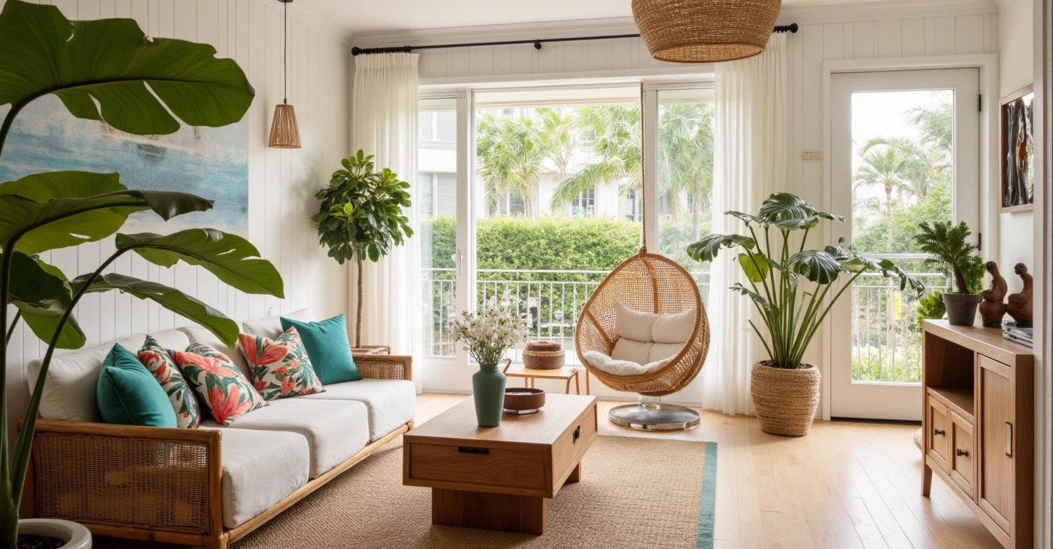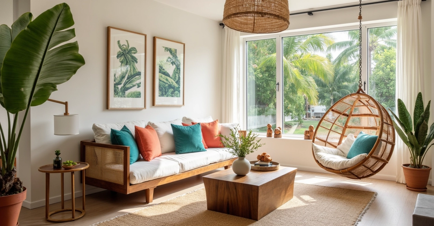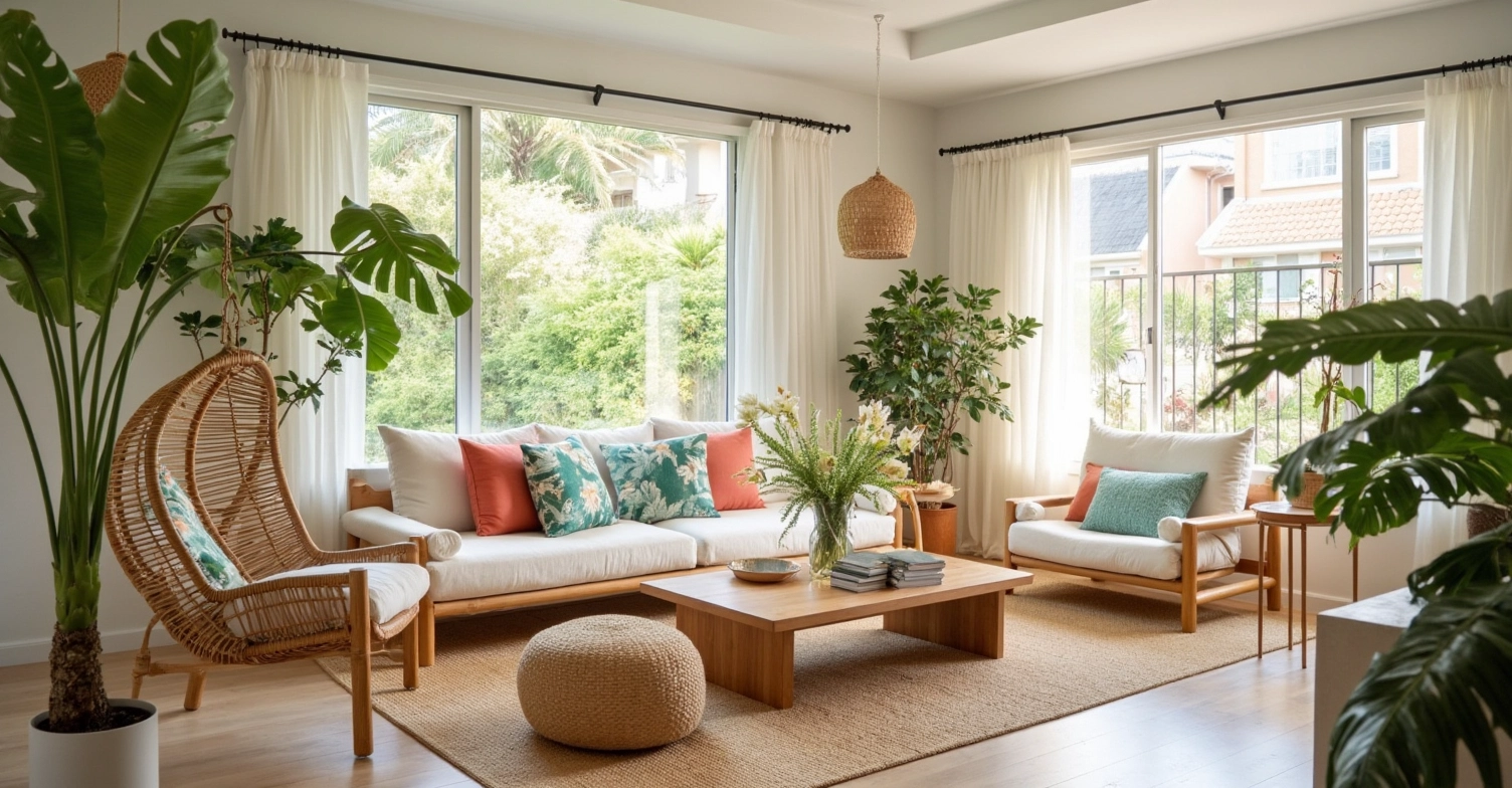 Colorful throw pillows, green plants echo with the tropical plants outside the window, creating a strong tropical atmosphere. Sufficient natural light spills in through the large windows, making the whole living room not only have the warmth of natural materials, but also full of tropical vitality and freshness, as if people can feel the comfort of being in a tropical garden here.