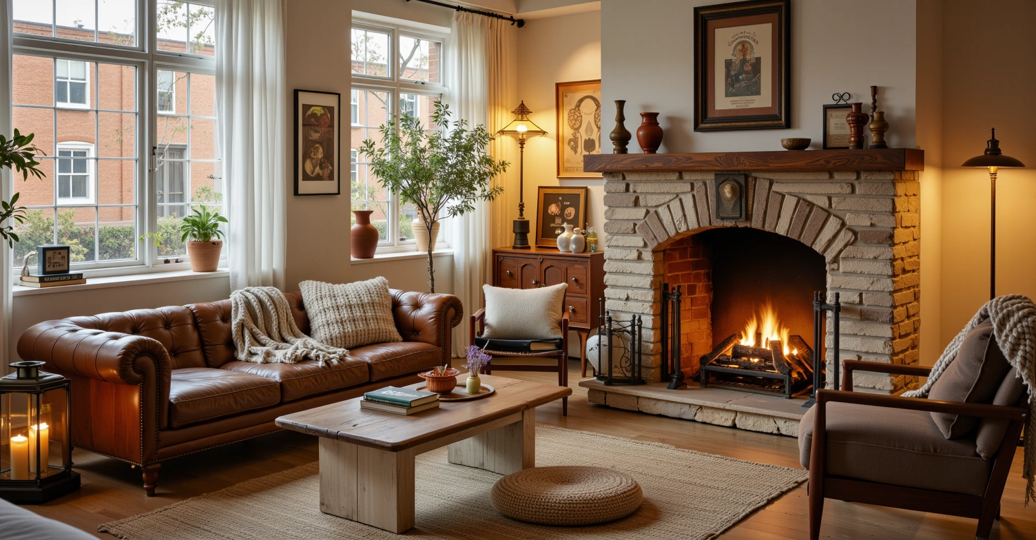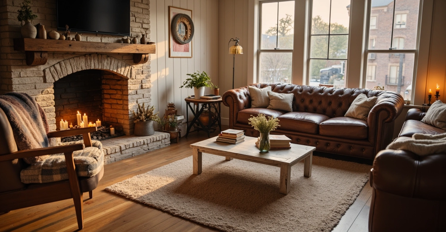 It creates a scene with leather furniture, stone fireplaces, and vintage soft furnishings. Warm brown tones integrate industrial elements, with artistic paintings and distressed ornaments dotted around. Every detail exudes the rustic warmth of vintage industrial style, as if injecting the retro charm of years into the home space.
