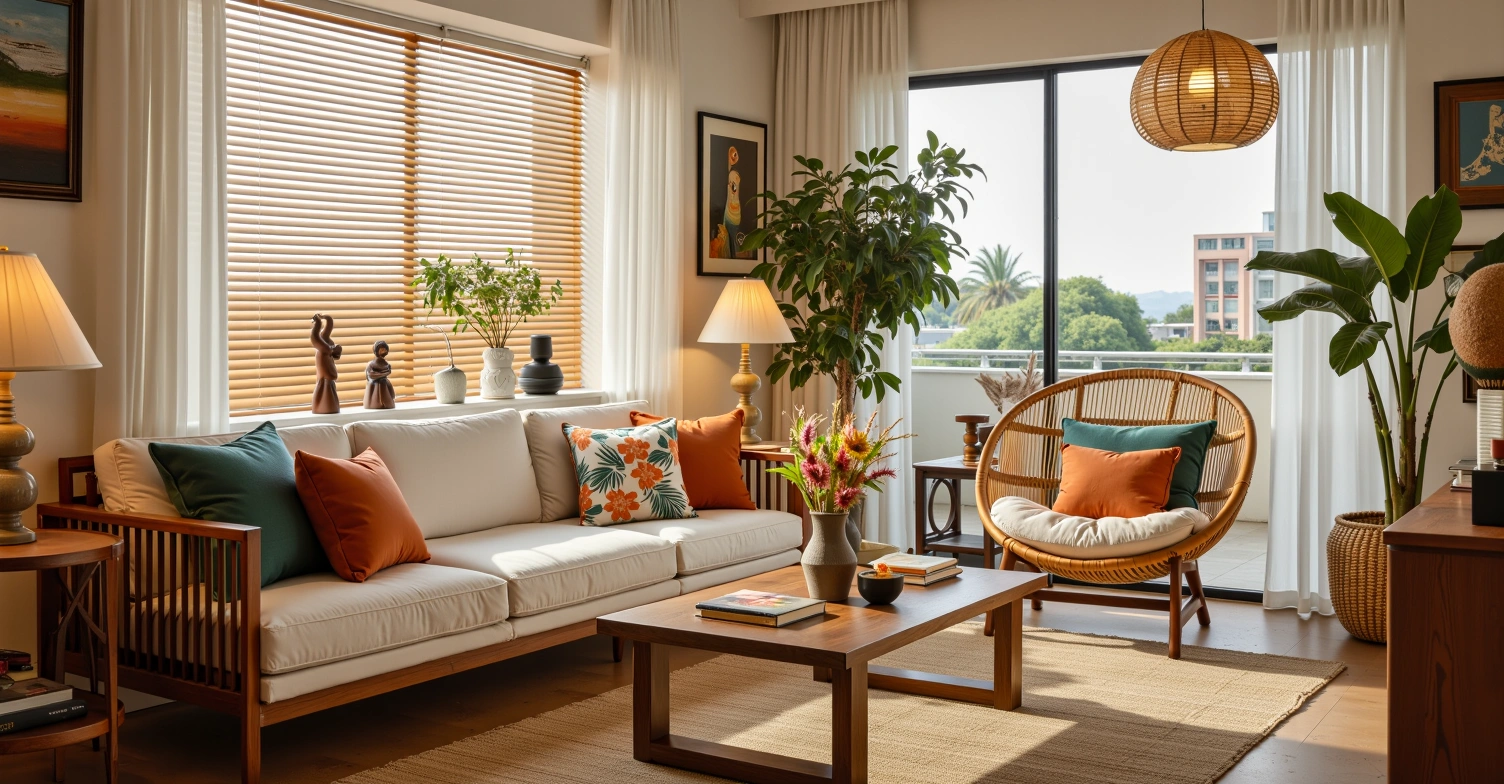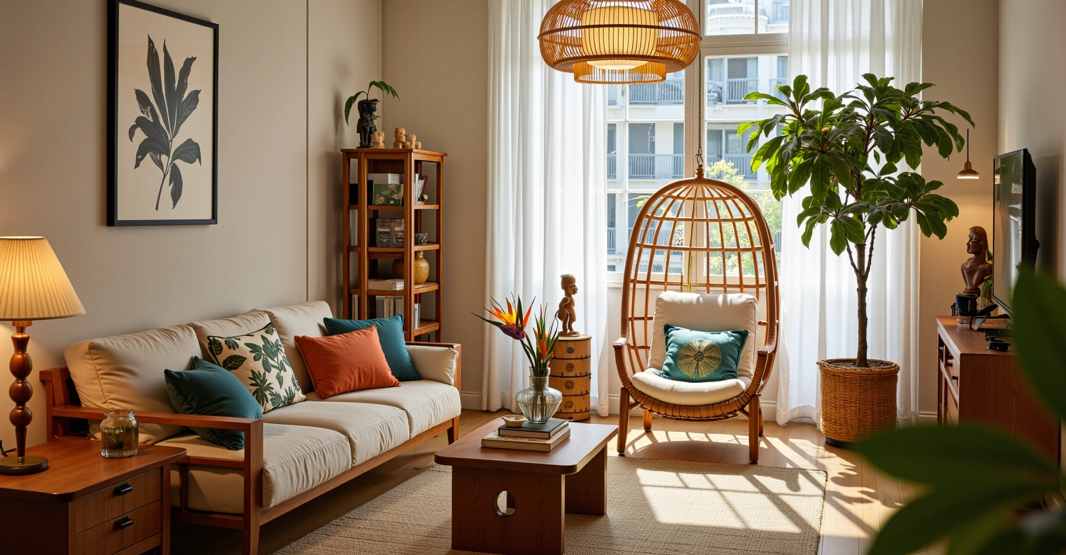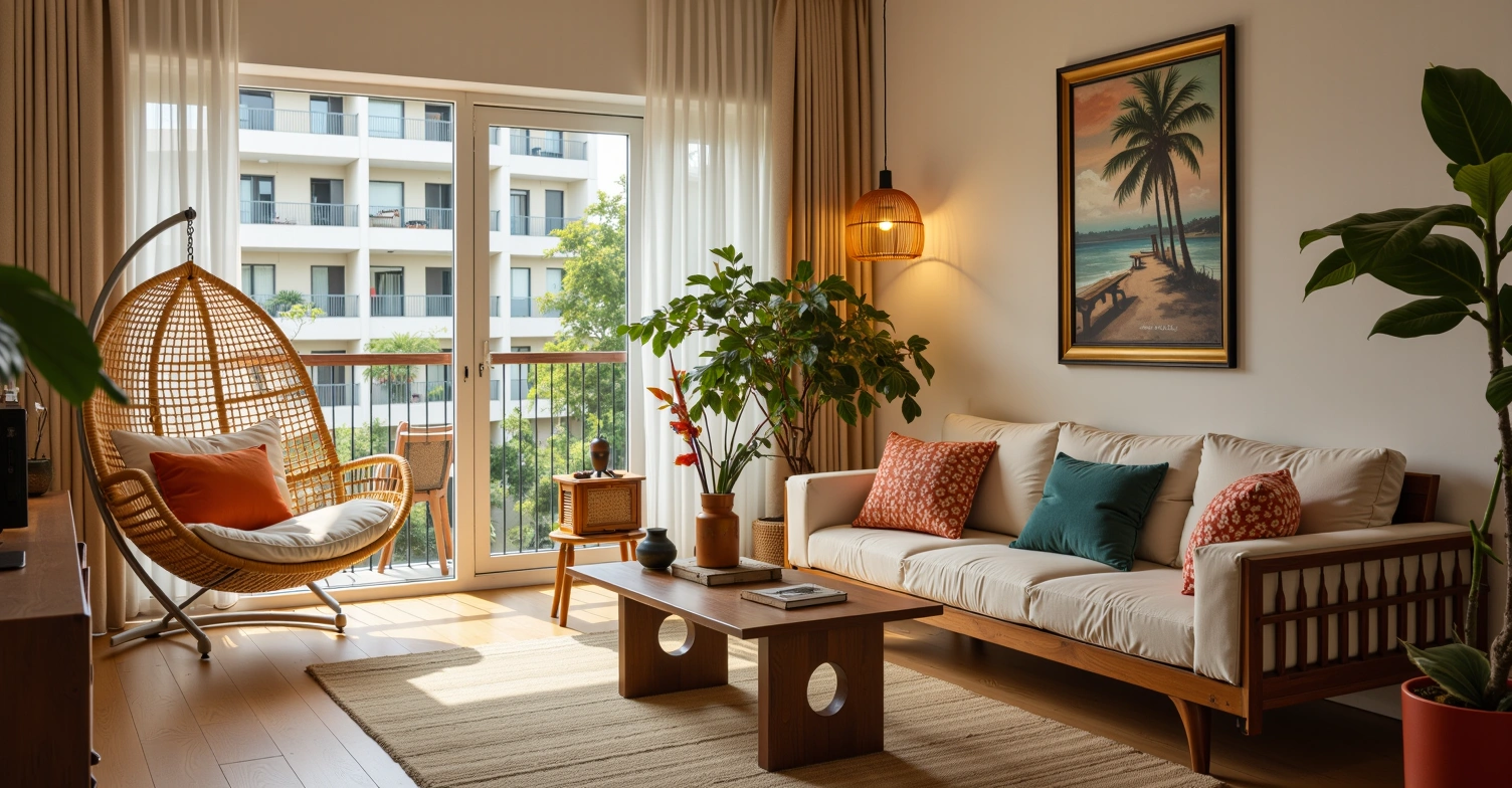 It creates a scene with rattan furniture, green plant soft furnishings, and artistic paintings. Warm brown tones integrate tropical elements, with handmade ornaments and colorful floral arrangements dotted around. Every detail exudes the vibrant naturalness of tropical Bohemian style, as if bringing the vacation charm of an island into the home space.