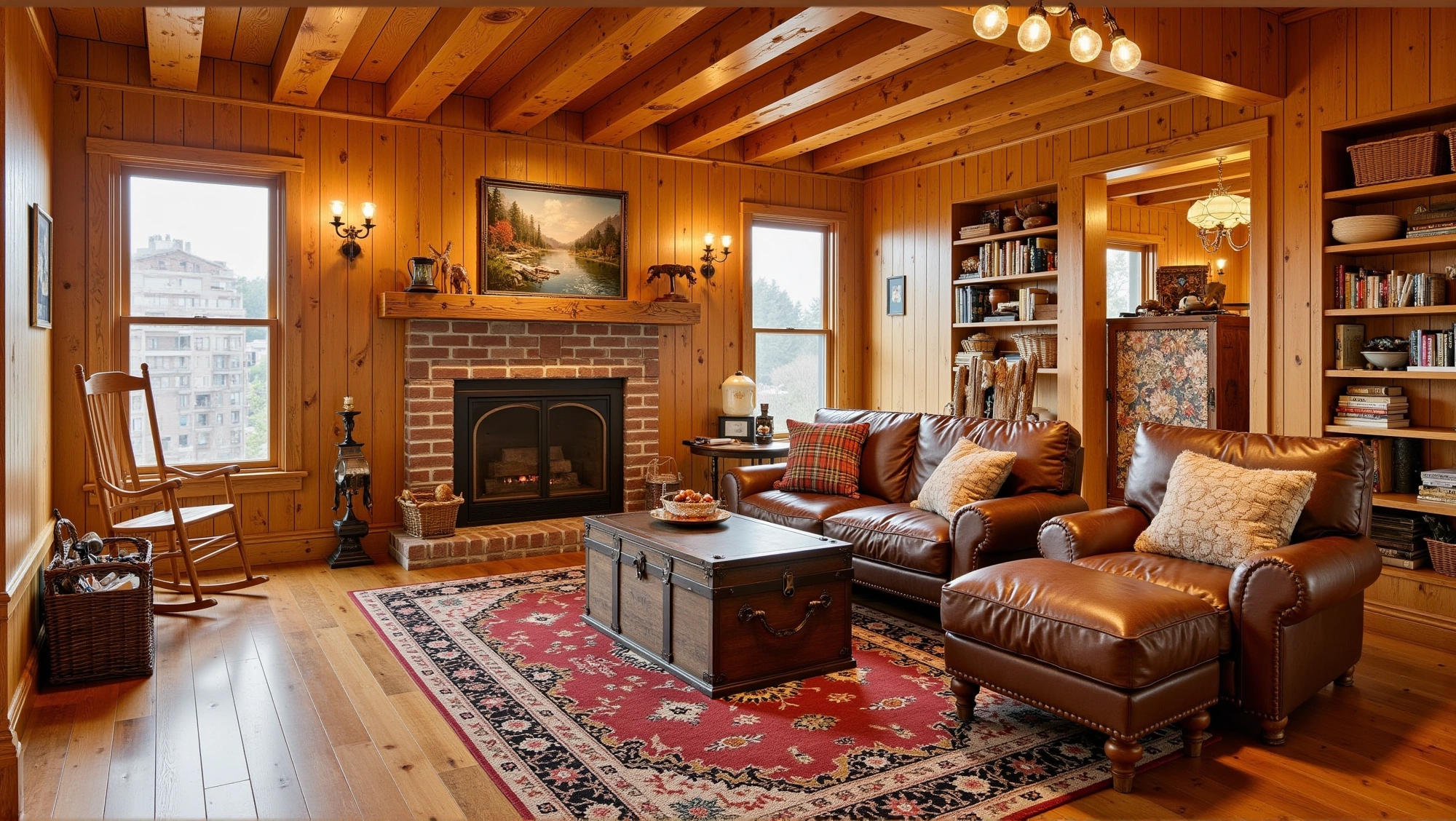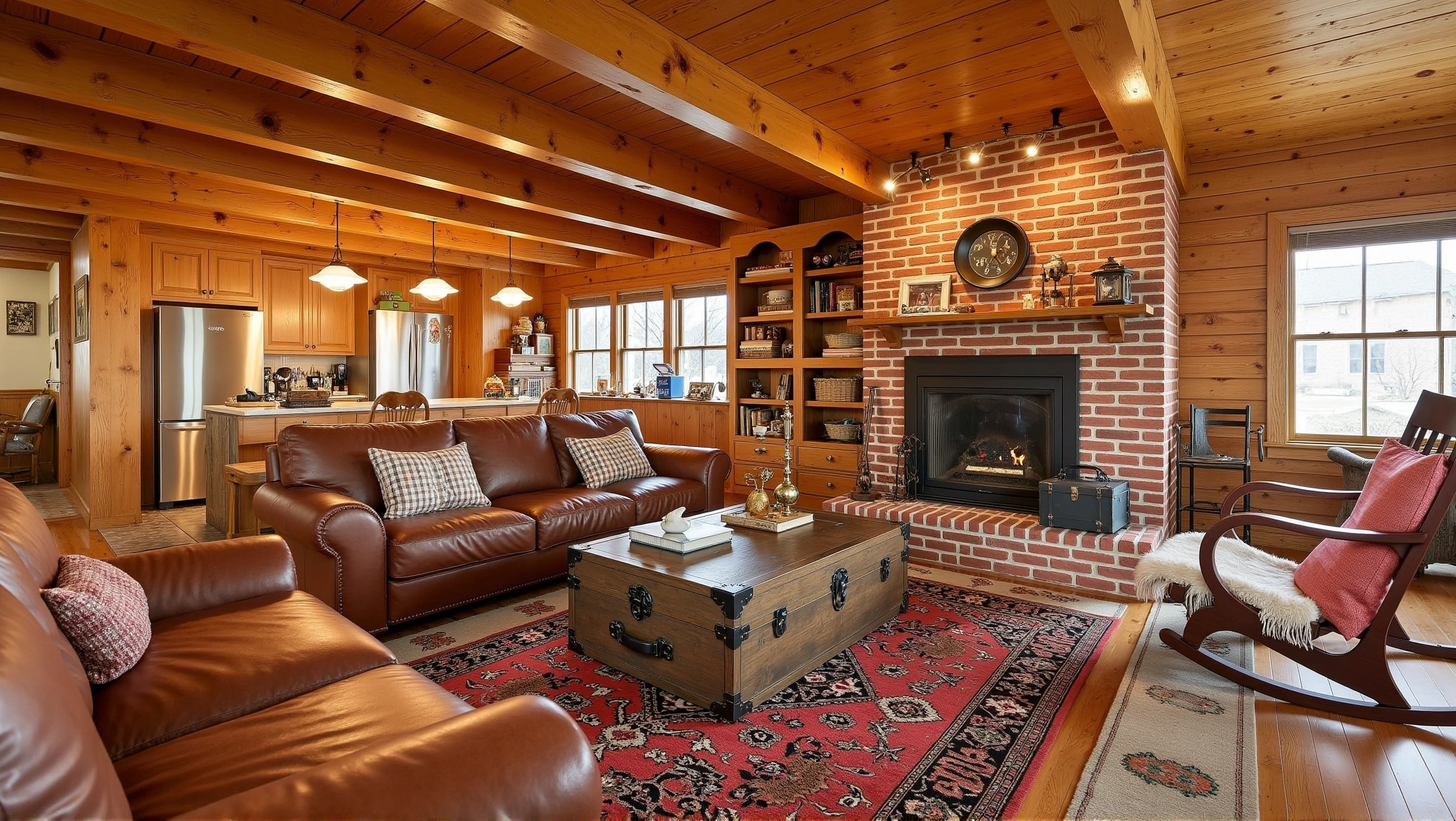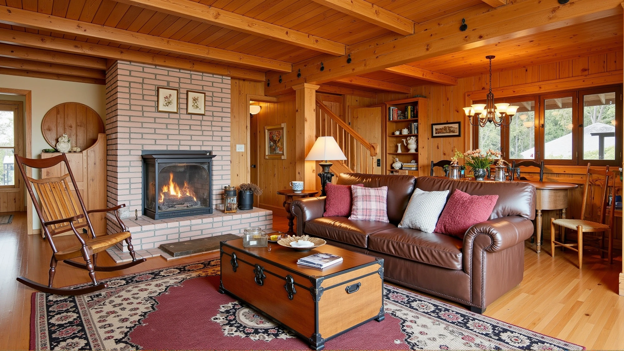 With a large amount of solid wood as the base, it combines the nostalgic texture of retro style and the natural warmth of mountain - style design, matched with a red brick fireplace, leather furniture and artistic paintings. It creates a retro mountain - living atmosphere full of homely warmth in warm light, and every furnishing conveys the unique warmth of the collision between nature and retro.