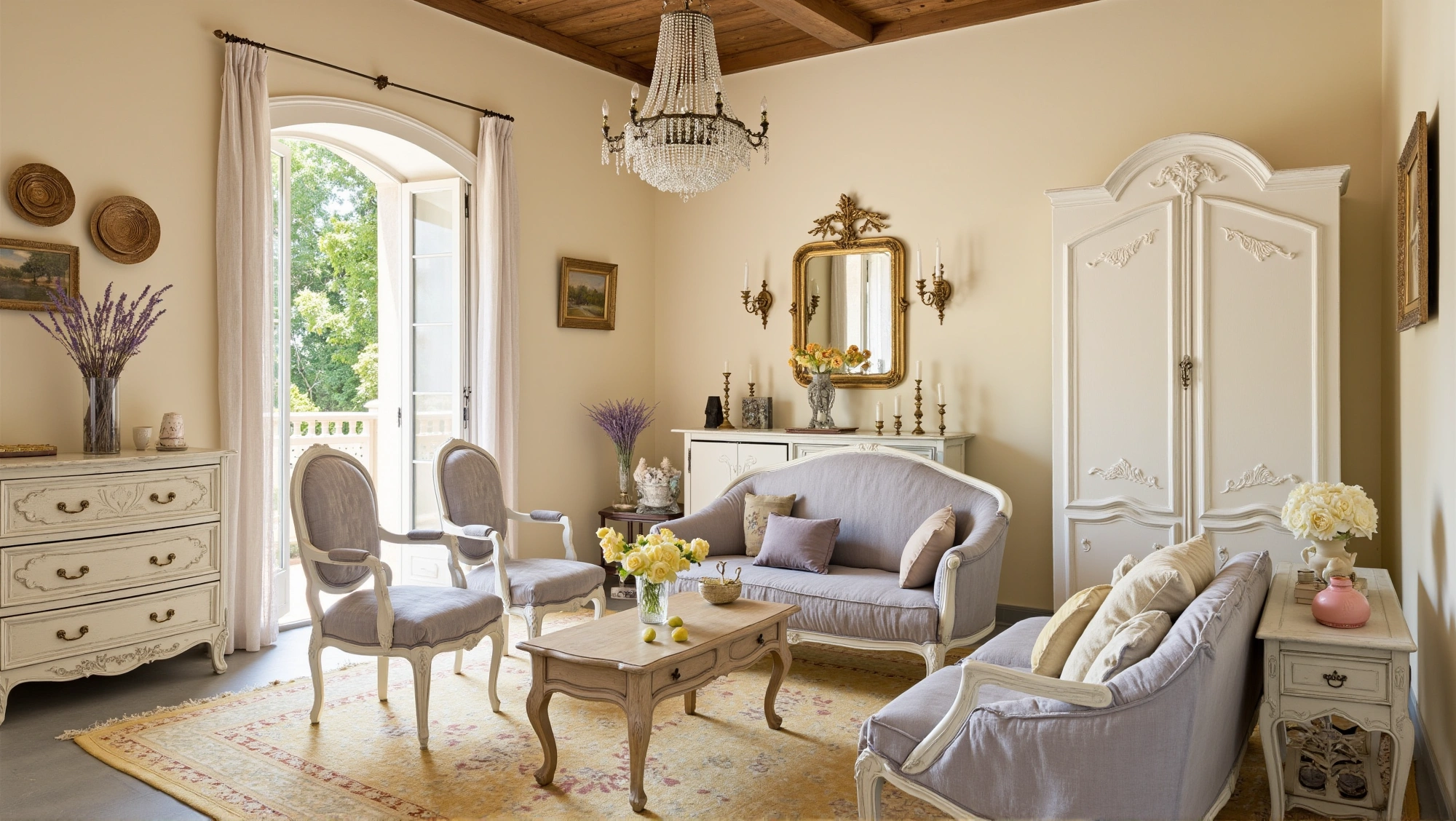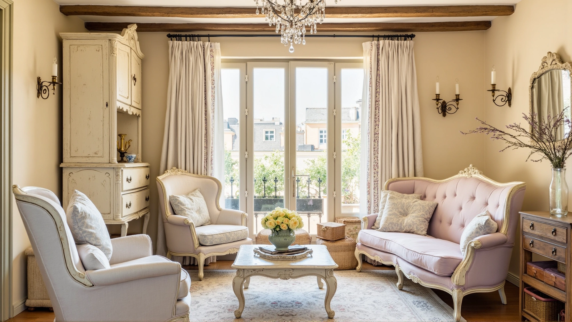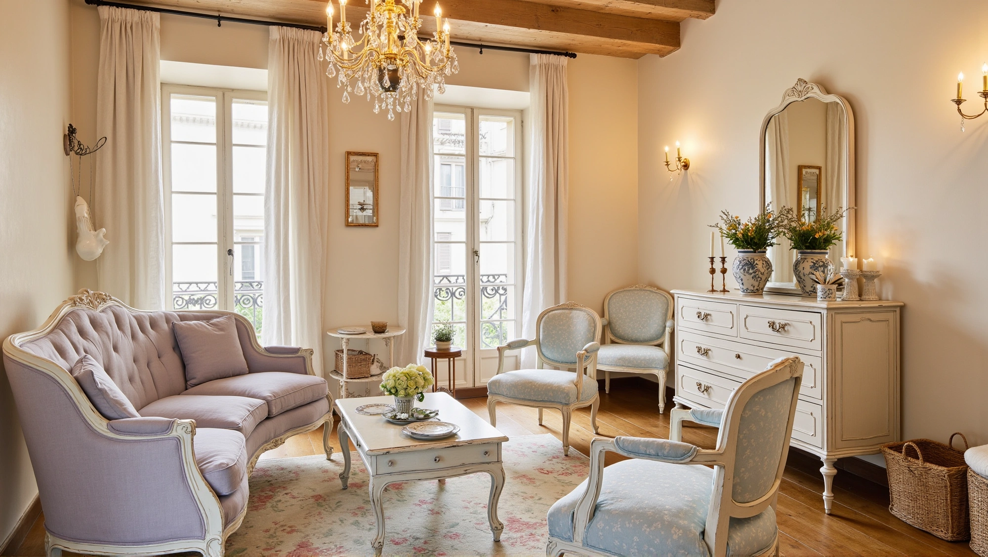 It creates a scene with carved furniture, crystal chandeliers, and vintage soft furnishings. Soft warm tones integrate exquisite details, with floral arrangements and art ornaments dotted around. Every detail exudes the elegant luxury of French vintage style, as if bringing the romantic charm of Parisian palaces into the home space.